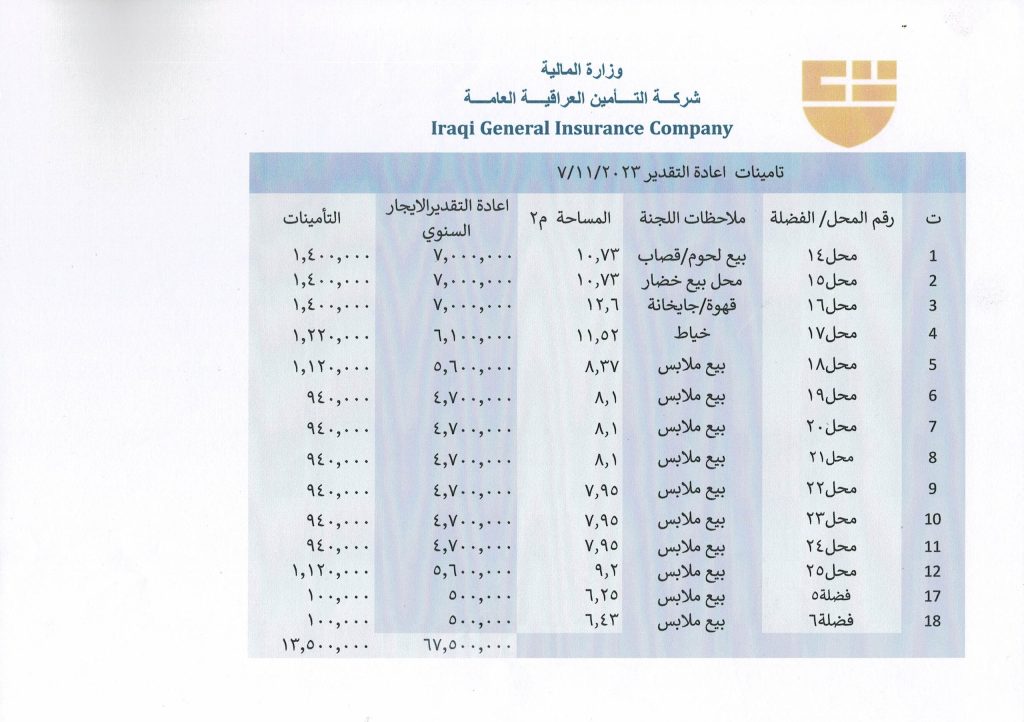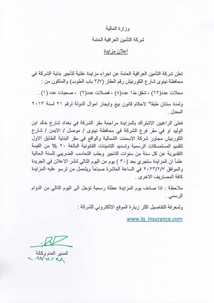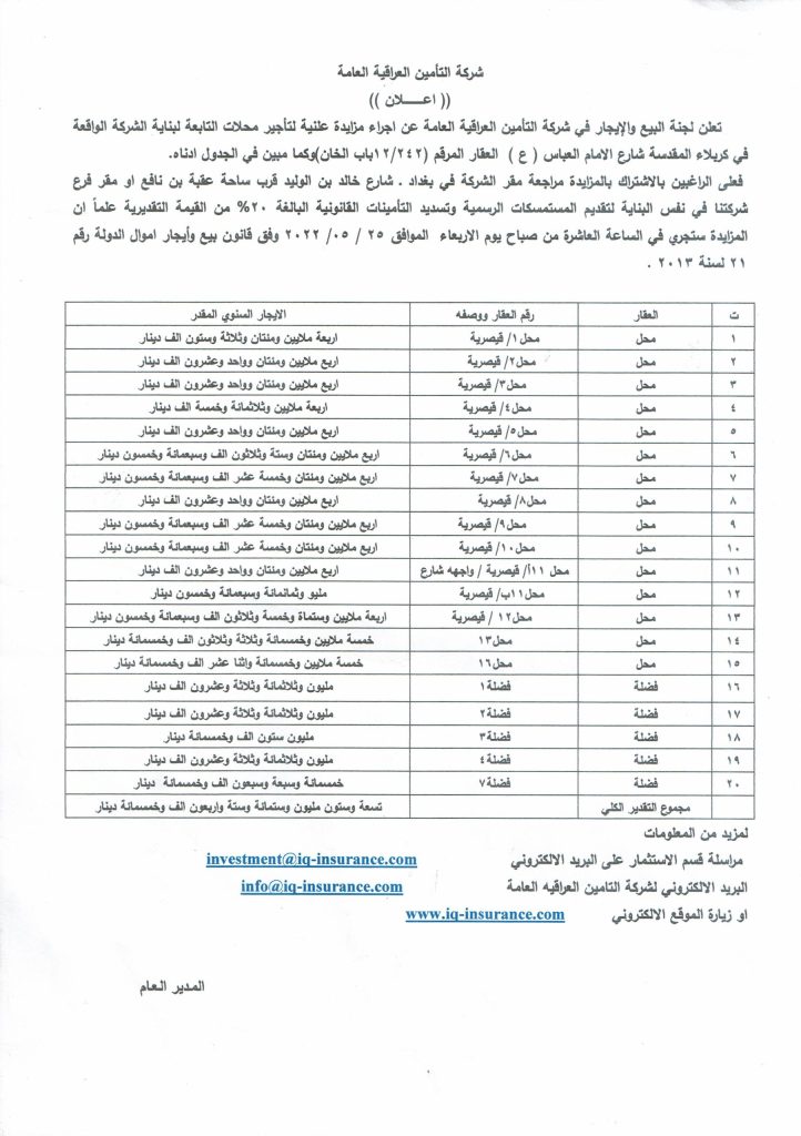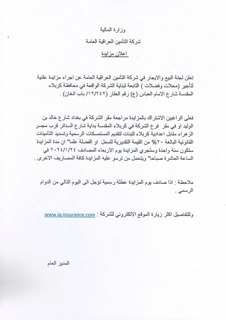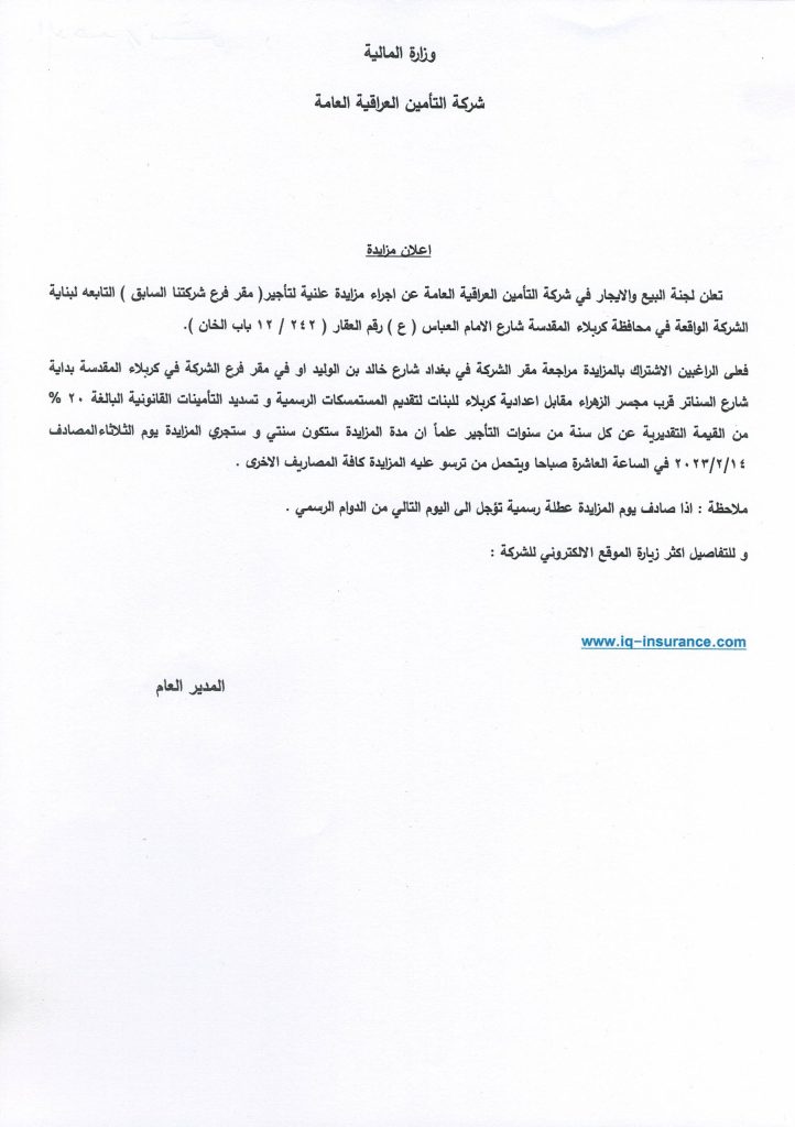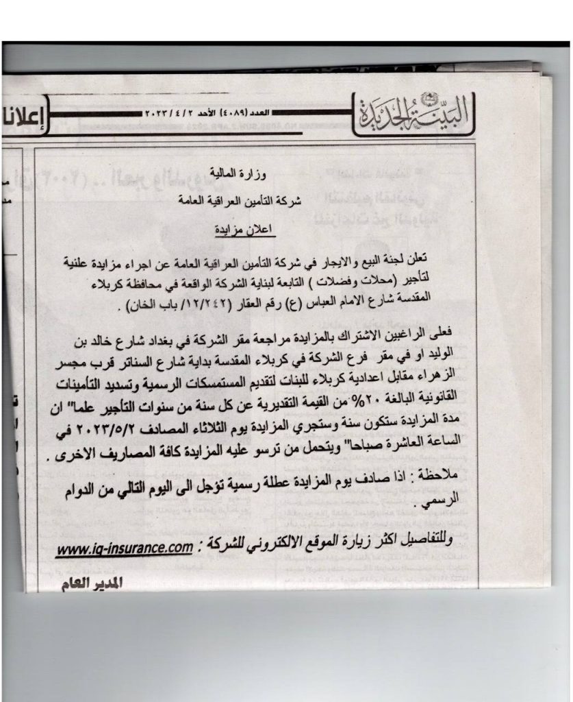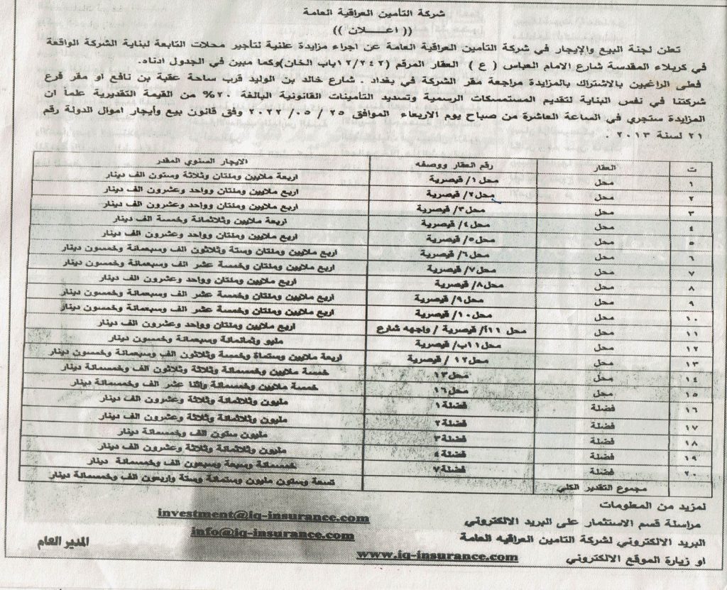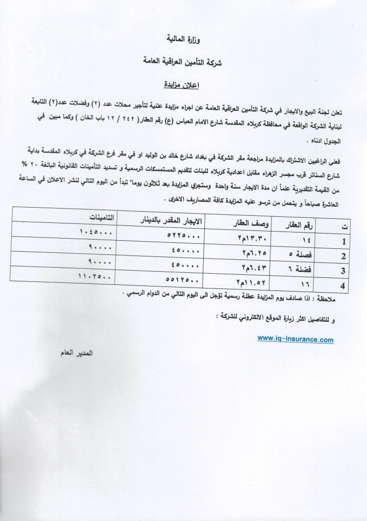 تعلن لجنة البيع والايجار في شركة التامين العراقية العامة عن اجراء مزايدة علنية لتاجير (محلات وفضلات)