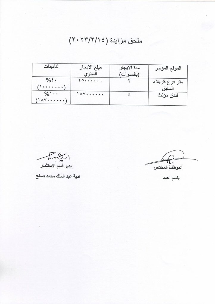 لبناية الحياة في النجف الاشرف ولمدة سنتان فعلى الراغبين بالاشتراك مراجعه مقر الشركة في بغداد شارع خالد بن الوليد قرب ساحة عقبة بن نافع او مقر فرع شركتنا في نفس البناية للاطلاع على تفاصيل العقار خلال ثلاثون يوما تبدا من اليوم التالي لنشرها في الصحف اليومية مستصحبين معهم المستمسكات الرسمية وتسديد التامينات القانونية البالغة 40% من القيمة التقديرية علما ان المزايدة ستجري في الساعه العاشرة من صباح يوم الاحد الموافق 11/4/2021 وفق قانون بيع وايجار امول الدولة رقم 21 لسنة 2013 المعدل علما ان المزايدة مفتوحة لمدة ثلاثة ايام . ولتفاصيل اكثر زيارة الموقع الالكتروني للشركة