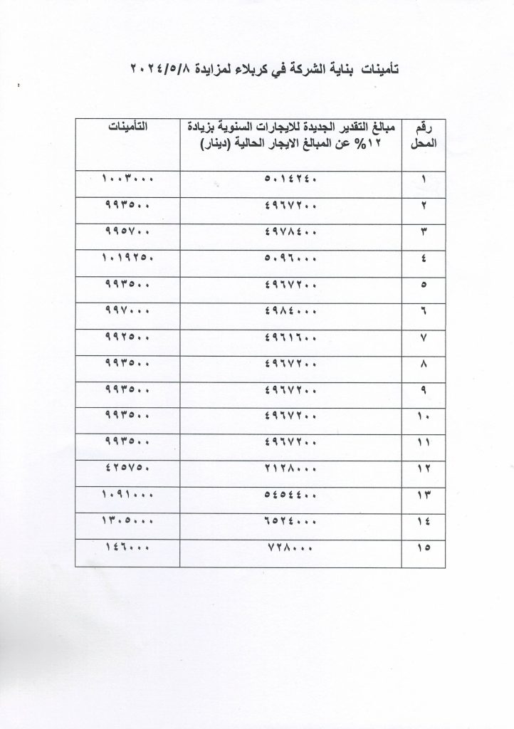 فعلى الراغبين الاشتراك بالمزايدة مراجعة مقر الشركة في بغداد شارع خالد بن الوليد او في مقر فرع الشركة في كربلاء المقدسة بداية شارع السناتر قرب مجسر الزهراء مقابل اعدادية كربلاء  للبنات لتقديم المستمسكات الرسمية وتسديد التأمينات القانونية البالغة 20% من القيمة التقديرية للمحل او الفضلة علما ان مدة المزايدة ستكون سنة واحدة وستجري المزايدة يوم الاربعاء المصادف 5/8/ 2024 في الساعة العاشرة صباحا ويتحمل من ترسو عليه المزايدة كافة المصاريف الاخرى .