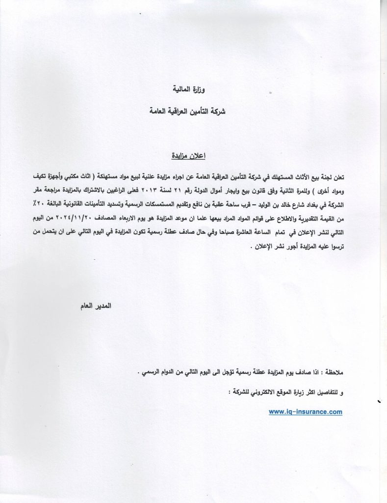 وزارة المالية / شركة التأمين العراقية العامة اعلان مزايدة تعلن لجنة بيع الاثاث المستهلك في شركة التأمين العراقية العامة عن أجراء مزايدة علنية لبيع مواد مستهلكة ( أثاث مكتبي وأجهزة [...]