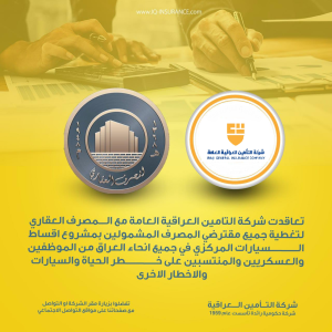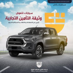 تأمين على السيارات والاليات ضد اخطار الاصطدام والانقلاب والسرقة والحريق والاضرار التي تسببها السيارات للأخرين .يسر شركة التأمين العراقية العامة , شركة حكومية تابعة لوزارة المالية ان تعلن للمواطنين والدوائر والشركات العاملة في العراق عن استمرارها باصدار وثائق التأمين للسيارات والتي تغطي اخطار ( السرقة – الحريق – الاصطدام – الانقلاب – المسؤلية المدنية -الاضرار التي تصيب الشخص الثالث) وخطر الارهاب … كل ذلك نوفره لكم باقساط سنوية زهيدة ….